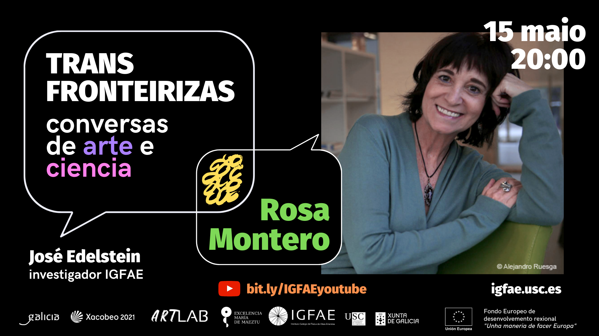 Organizado por el Instituto Galego de Física de Altas Enerxías (IGFAE) de la Universidade de Santiago de Compostela (USC) y la Xunta de Galicia, ‘Transfronteirizas, conversas de arte e ciencia’ es un ciclo de diálogos virtuales emitidos en Youtube en el que invitamos a figuras del ámbito cultural a explorar las intersecciones entre el arte y la ciencia con nuestro personal investigador, buscando un enfoque interdisciplinar. El objetivo es tender puentes y fomentar la participación entre la sociedad y la comunidad investigadora a través de distintas expresiones artísticas.