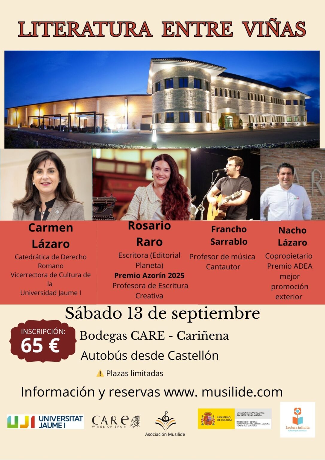 Jornada literaria en las Bodegas Care con la presencia de Rosario Raro (premio Azorín de novela 2025) Carmen Lázaro y la música de Francho Sarrablo