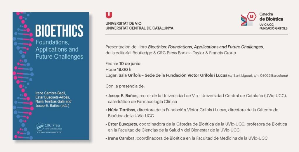 El 10 de junio presentaremos al público el libro “Bioethics: Foundations, Applications and Future Challenges” de la editorial Routledge & CRC Press Books que trata la bioética desde tres perspectivas: sus fundamentos, el debate actual en bioética asistencial y los retos de futuro de esta disciplina.