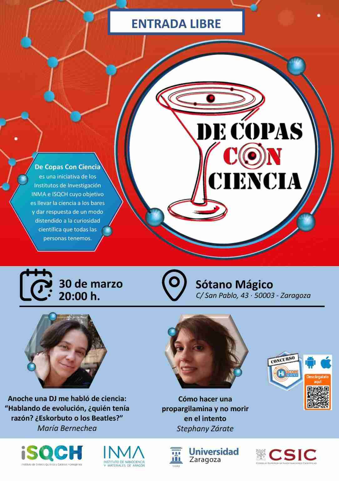 ‘De copas con ciencia’ es una actividad gratuita de divulgación científica organizada por el Instituto de Nanociencia y Materiales de Aragón (INMA, CSIC-UNIZAR) y del Instituto de Síntesis Química y Catálisis Homogénea (ISQCH, CSIC-UNIZAR) que se celebra el último jueves de cada mes en El sótano mágico (Zaragoza).